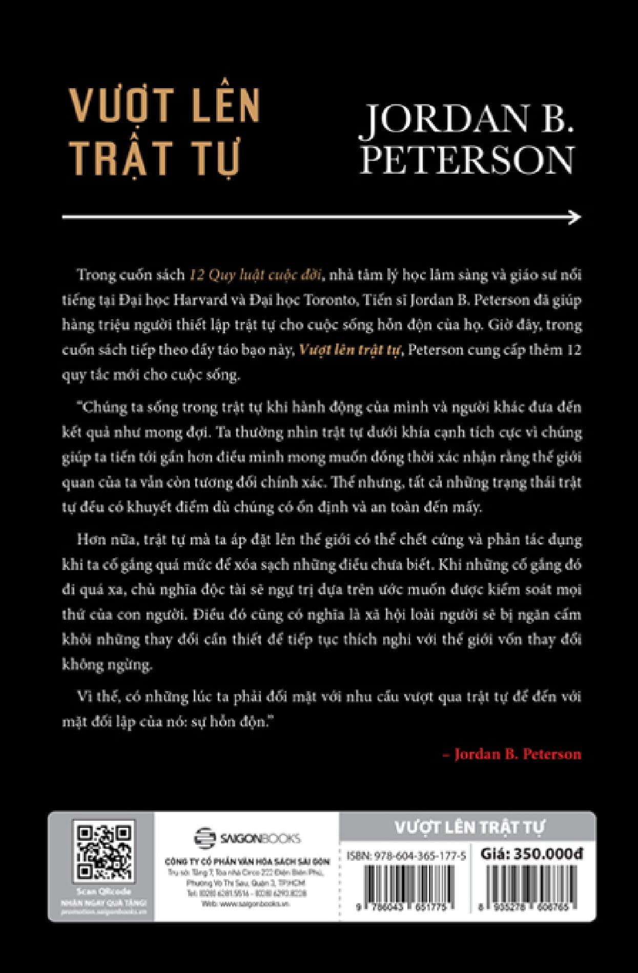Vậy là cuốn sách tiếp – Vượt Lên Trật Tự của Giáo sư Jordan Peterson ra đời như một liều thuốc giải giúp bạn giải quyết những biến động, rối loạn và bất định. Vẫn là 12 quy luật, nhưng khác với “12 rules for life”, 12 bộ quy tắc củhư một “cứu cánh” giúp bạn nhận ra rằng trật tự thực ra rất mong manh, rằng “Con người vốn yếu đuối. Vì thế, cuộc sống luôn khó khăn và đau khổ thì đầy rẫy.” Và “để xoa dịu những khổ đau đó (như đảm bảo mọi người đều có đủ thức ăn, nước sạch và một nơi ở đàng hoàng, sạch sẽ), chúng ta cần đến sự mạnh dạn sáng tạo, nỗ lực và năng lực.”