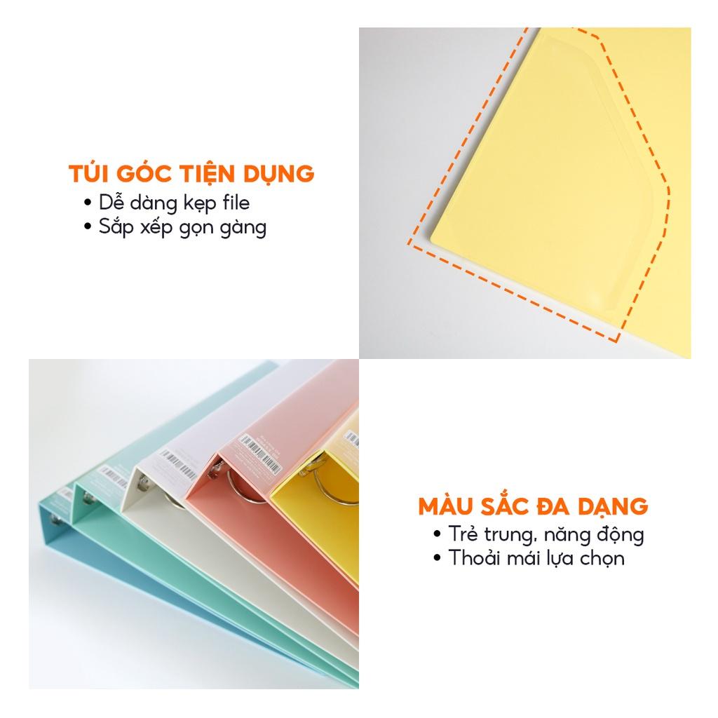 ĐẶC TÍNH NỔI BẬT:- 4 còng chữ O giúp túi tài liệu ngay ngắn (dễ sử dụng, phù hợp với nhiều loại túi 30 lỗ, túi 11 lỗ)- Bìa nhựa PP dày dặn, bền hơn, cứng cáp, dễ đứng vững- Túi góc tiện lợi, kẹp tà...