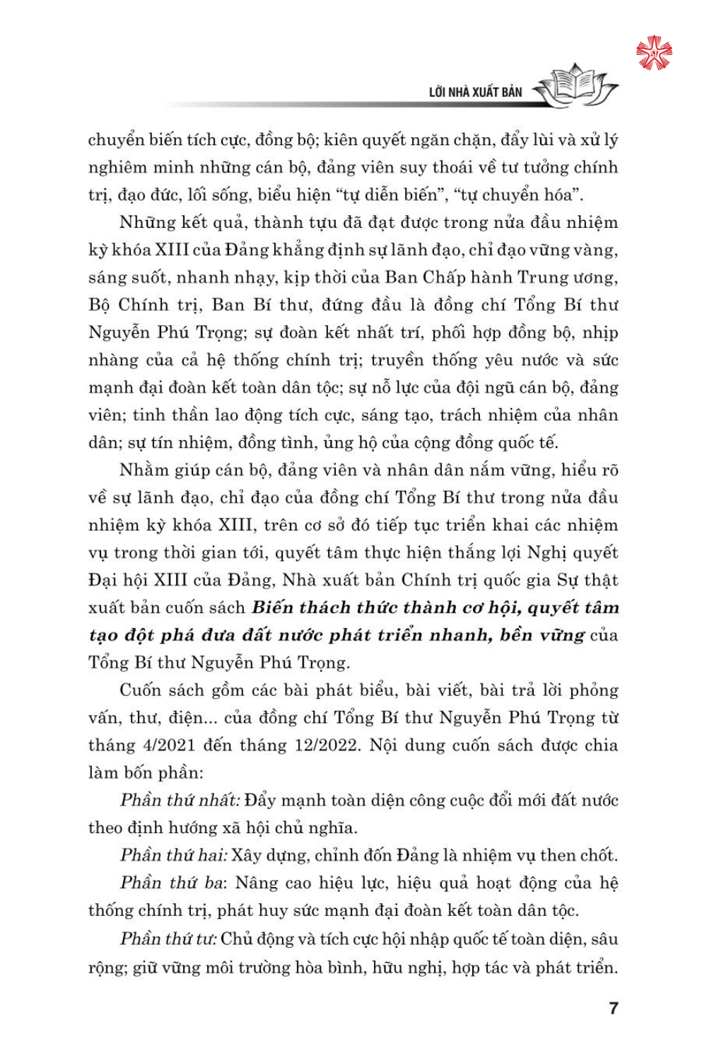 Cuốn sách “Biến thách thức thành cơ hội, quyết tâm tạo đột phá đưa đất nước phát triển nhanh, bền vững” tuyển chọn các bài phát biểu, bài viết, bài trả lời phỏng vấn, thư, điệ của đồng chí Tổng Bí thư Nguyễn Phú Trọng từ tháng 4/2021 đến tháng 12/2022.
