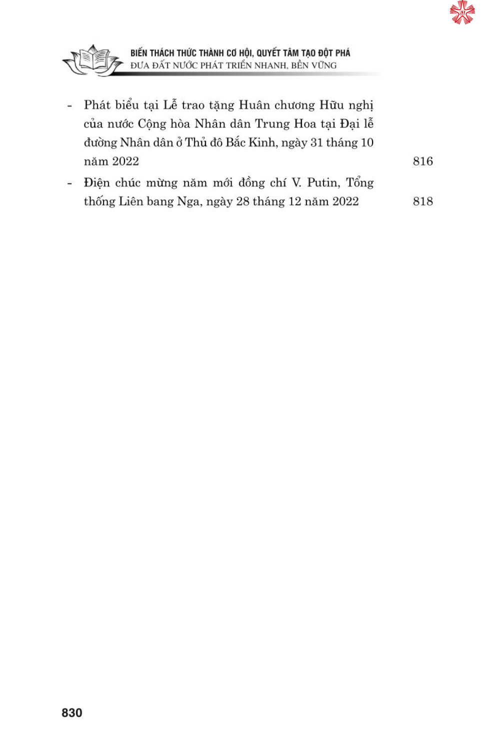 Cuốn sách “Biến thách thức thành cơ hội, quyết tâm tạo đột phá đưa đất nước phát triển nhanh, bền vững” tuyển chọn các bài phát biểu, bài viết, bài trả lời phỏng vấn, thư,