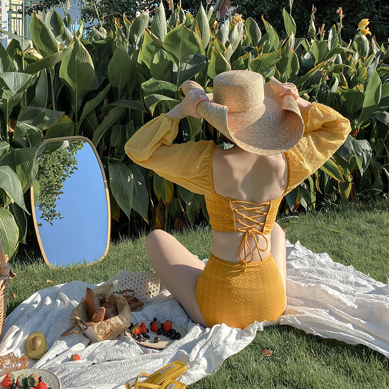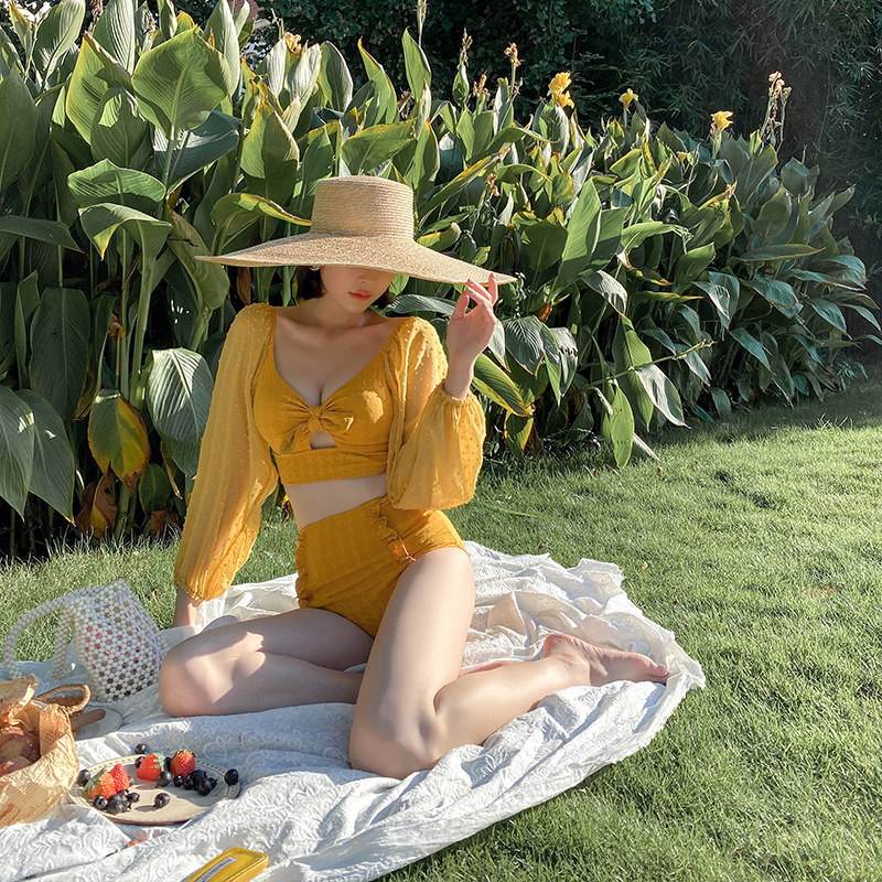 Set Đồ Bơi Nữ Rời Đùi Dài Tay Đi Biển Đi Bơi Chất liệu Polyester 95%, mật độ dệt vừa Áo có sẵn lớp đệm, hông áo có thể rút lên làm croptop cá tính