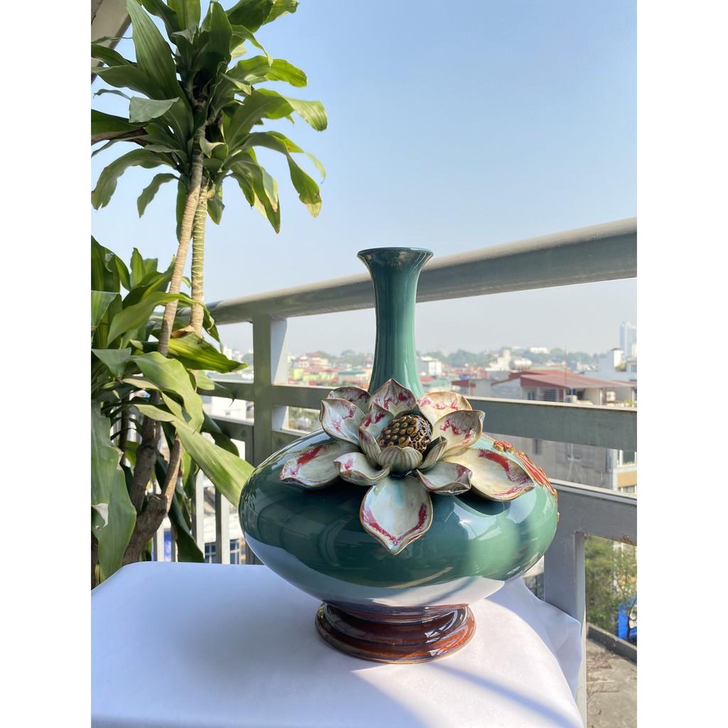 Mua tại TiktokBình hút tài lộc sứ Bát Tràng cao cấp, dáng cổ cao, bụng dẹt, men xanh hỏa biến với nước men căng bóng, sáng mịn cùng với họa tiết hoa sen đắp nổi cầu kỳ, được thực hiện thủ công 100% bởi bàn tay của các nghệ nhân lành nghề. Sản phẩm được trưng bày tại phòng khách, phòng làm việc, văn phòng, cửa hà vừa có tác dụng thu hút tài lộc đến cho chủ nhân vừa có tác dụng trưng các loại hoa theo mùa, giúp trang trí không gian trở nên ấn tượng, thu hút, mới mẻ, hấp dẫn. Bình hút tài lộc cao 35cm, miệng bình 6cm, vòng bụng bình 87cm