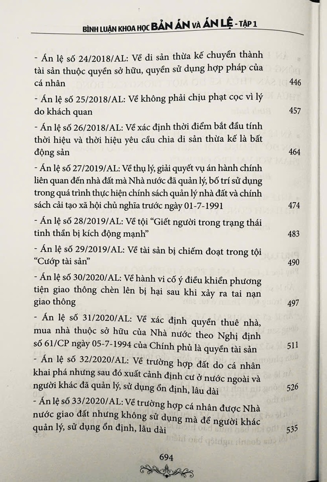 Hy vọng cuốn sách sẽ đáp ứng được phần nào nhu cầu của đông đảo bạn đọc, trước hết là các cán bộ trong các cơ quan tư pháp, các luật sư, các nhà nghiên cứu, các giảng viên, sinh viên luật... trong việc tìm hiểu, nghiên cứu, tham khảo, ứng dụng các án lệ đã được công bố; đồng thời, giúp người dân có thêm vốn kiến thức pháp luật về các tình huống tranh chấp được chọn là án lệ, có thể tự bảo vệ quyền và lợi ích hợp pháp của mình một cách tốt nhất.