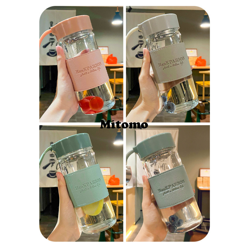 ✨Bình Nước Thủy Tinh Cao Cấp Bọc Da Mitomo, Chịu Lực, Chịu Nhiệt, Có Dây Đeo Kèm Bộ Lọc Inox 304 Dung Tích 500ML hàng chính hãng