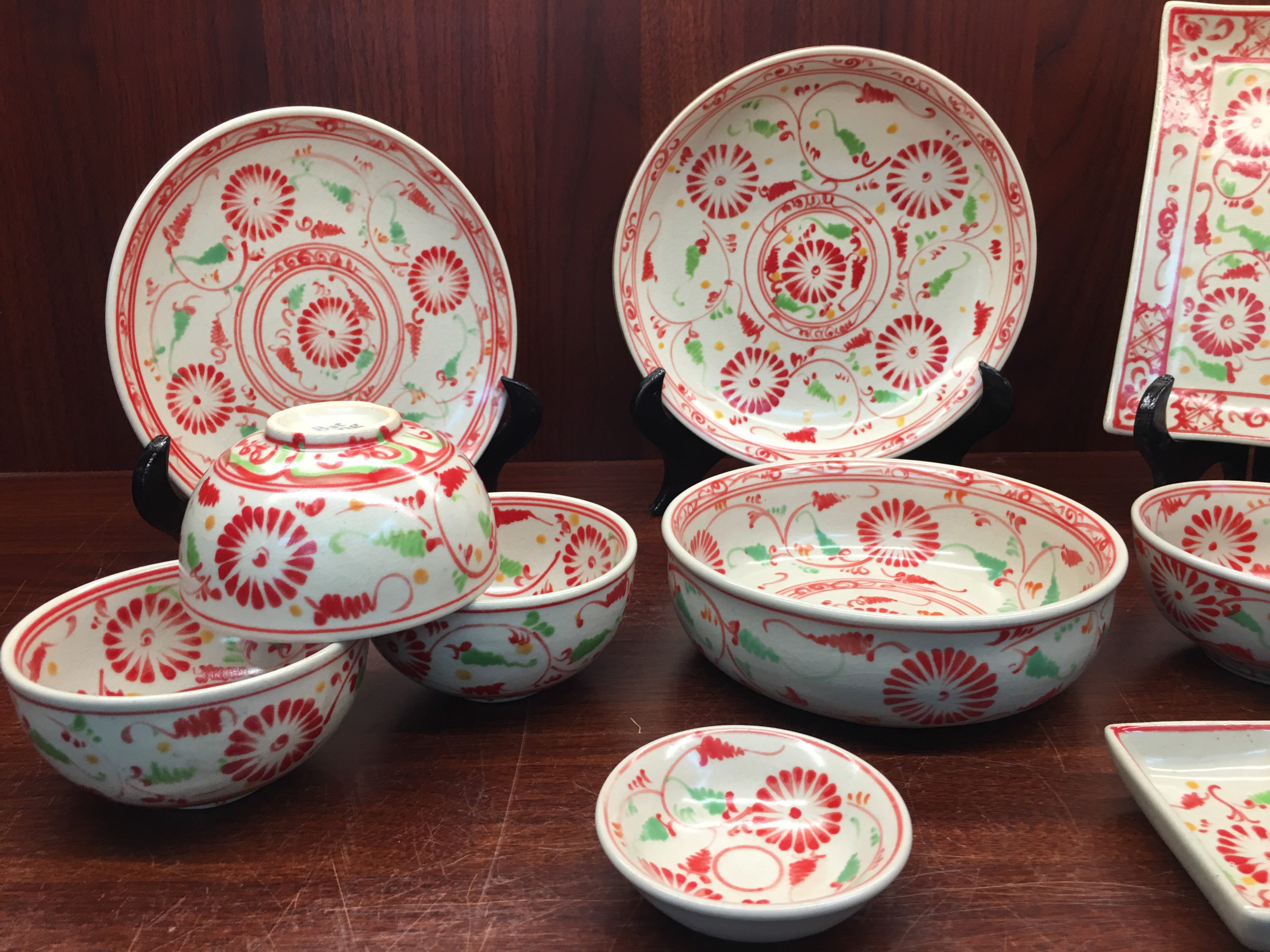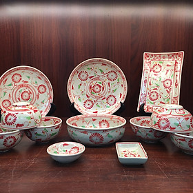 Mua tại TiktokChi tiết Bộ bàn ăn 12 sản phẩm Bát Tràng vẽ hoa văn đỏ cao cấp gồm :