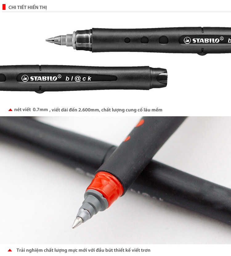 - Đầu bi: 0.8 mm dạng Cone , sản xuất tại Thụy Sĩ. - Grip cùng màu mực - Độ dài viết được: 1.200-1.500m. - Thân bút thanh mảnh cơ chế bấm khế tiện dụng