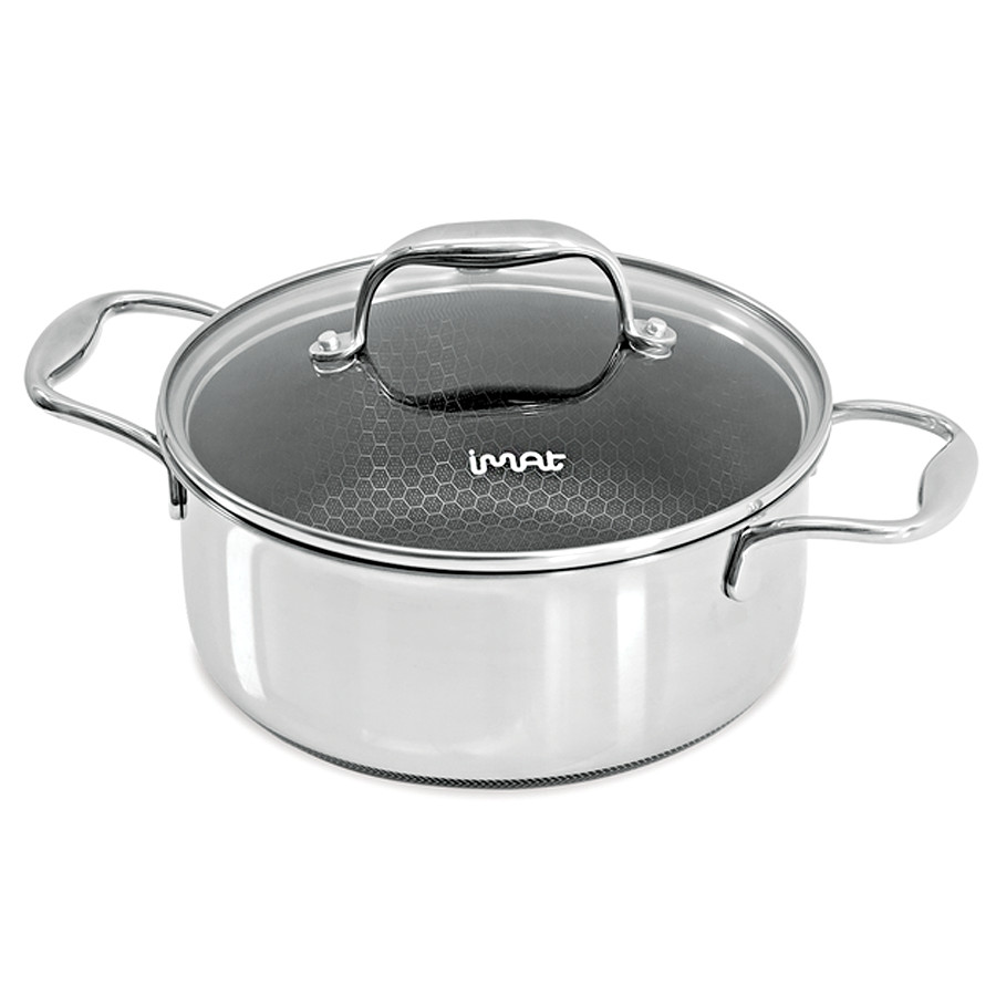Vung nồi bằng thuỷ tinh chịu nhiệt, trong suốt nên dễ quan sát thực phẩm trong khi nấu. Logo iMat in sắc nét trên vung và đáy nồi.