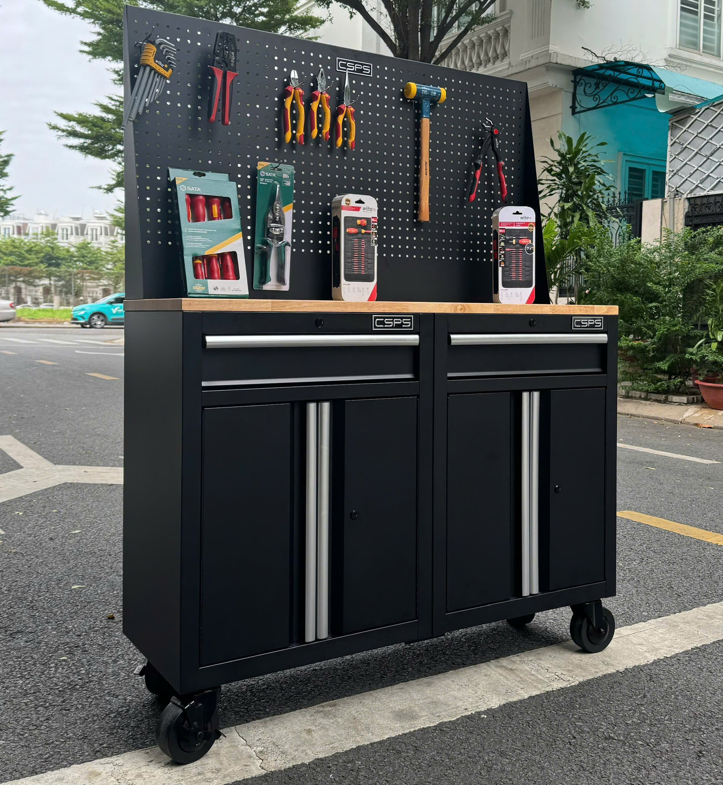 ✨Bộ 2 Tủ dụng cụ CSPS 122cm màu đen mặt ván gỗ kèm vách lưới - 02 hộc kéo (tay cầm trắng)