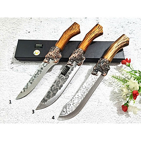 D SỐ 4 : TỔNG DÀI : 32cm, LƯỠI: 18cm,RỘNG : 4.5cm, dày: 3mm, NẶNG : 2.3 lạng, CHẤT liệu lưỡi: 4Cr13MOV (thép 4 crom 13 molypden vanadi).Chất liệu CÁN: nhựa abs xịn . khâu đầu rồng và chuôi bằng thép 4cr13