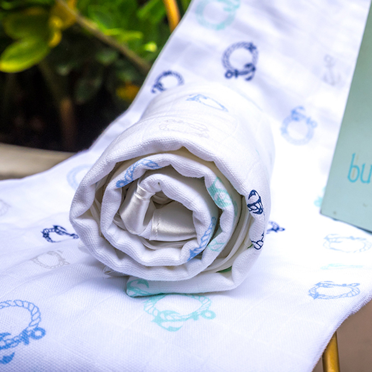 Họa tiết bông hoa được đính trên nền vải gấm khổ lớn ba lớp. Gạc ba mềm và nhẹ sử dụng sợi hữu cơ nhẹ nhàng quấn bé. Ngoài khả năng thoáng khí và hút nước