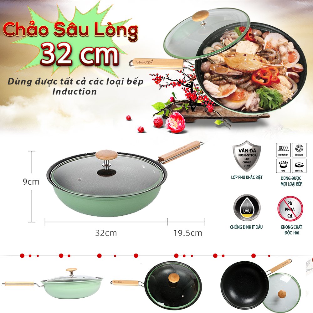 Chảo sâu lòng 32cm: 32 x 9 cm – Cán tay cầm: 19.5 cm