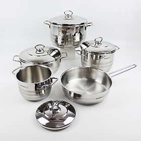 Bộ nồi chảo inox 304 cao cấp 5 đáy Kalpen Lermat L2 chuẩn công nghệ Đức Mã sản phẩm: L2 Thương hiệu: Kalpen xuất xứ Đức Dòng sản phẩm: Lermat Chất liệu: Inox 304, vung kính cường