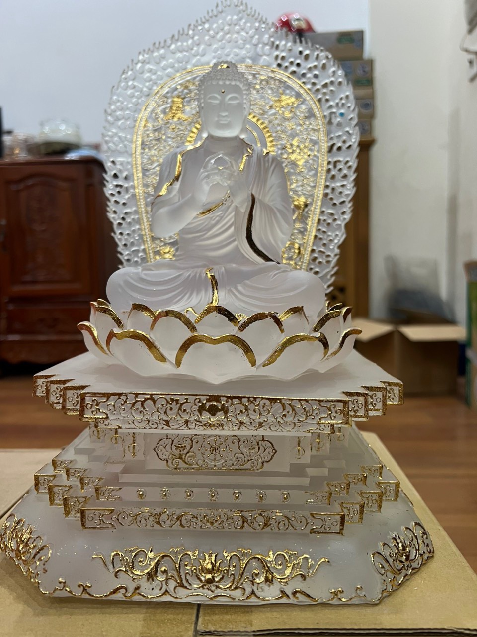Tượng Phật Bà Quan Âm Mới Đá Lưu Ly Trắng Để Trong Xe Hơi hoặc Để Bàn cao 12cm đk 7cm đế 5cm Mệnh Kim mệnh Thủy ạ *** Tượng Phật Bà Quan Âm Mới