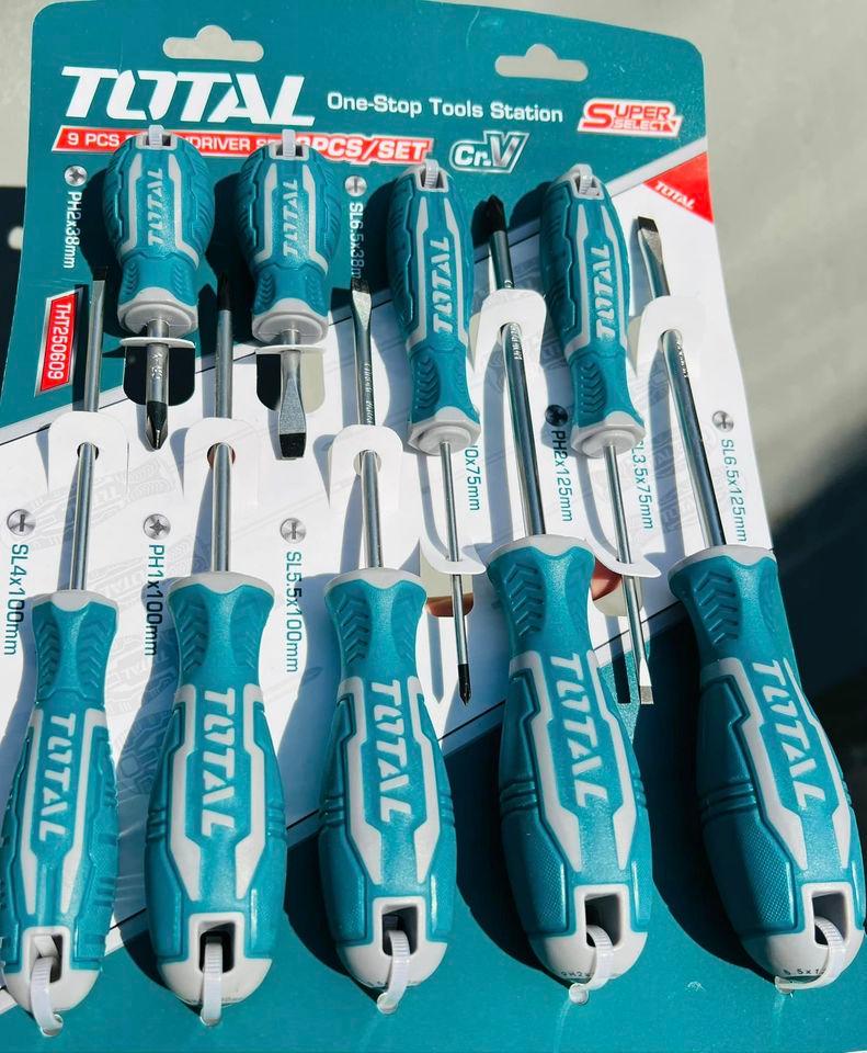Thông số kĩ thuật -Mã sản phẩm: THT250609 -Nhà sản xuất: Total -Bộ 9 tua vít với tay cầm thiết kế mới. Chất liệu: CR-V, Lưỡi tròn -1 tua vít SL6.5 6 38. 1 tua vít SL3.0 3 75 -1 tua vít SL4.0 4 100. 1 tua vít SL5.5 5 100 -1 tua vít SL6.5 6 125. 1 tua vít PH0 3 75 -1 tua vít PH2 6 38. 1 tua vít PH1 5 100 -1 tua vít PH2 6 125. Đóng gói bằng móc treo PP. 20/T
