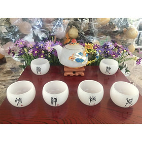 Chất liệu: Đá bạch ngọc Bao gồm: 01 ấm; 06 chén, 1 tách đựng nước thừa và hộp đựng cao cấp Kích thước : Dài 36 cm x 25 cm x 13 cm ( Bao