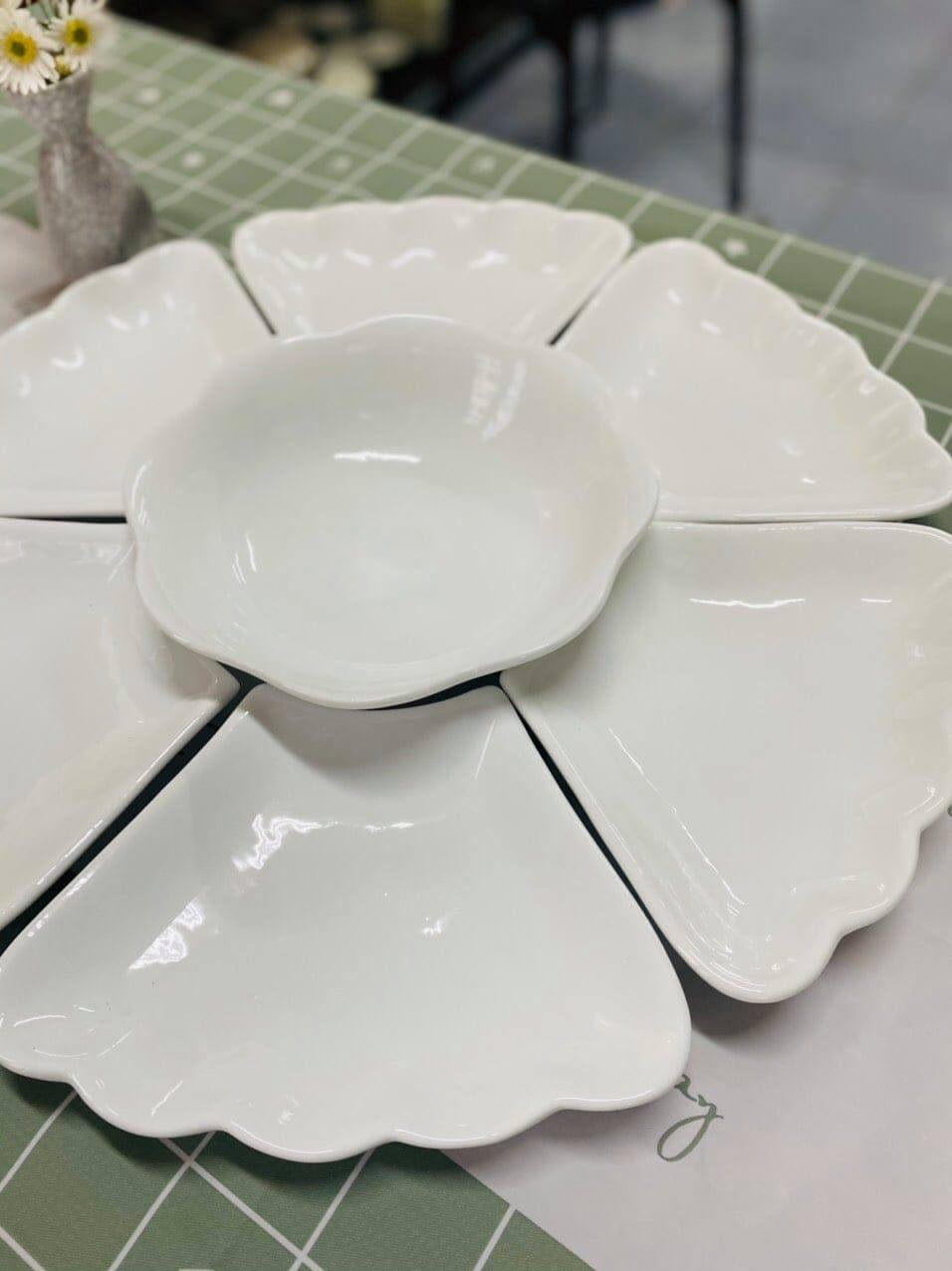 Set đĩa hoa mặt trời gốm sứ Bát Tràng cao cấp men trắng sang chảnh 1 set gồm : 1 bát tô , 6 đĩa cánh hoa , 6 bát cơm, 1 bát mắm ,