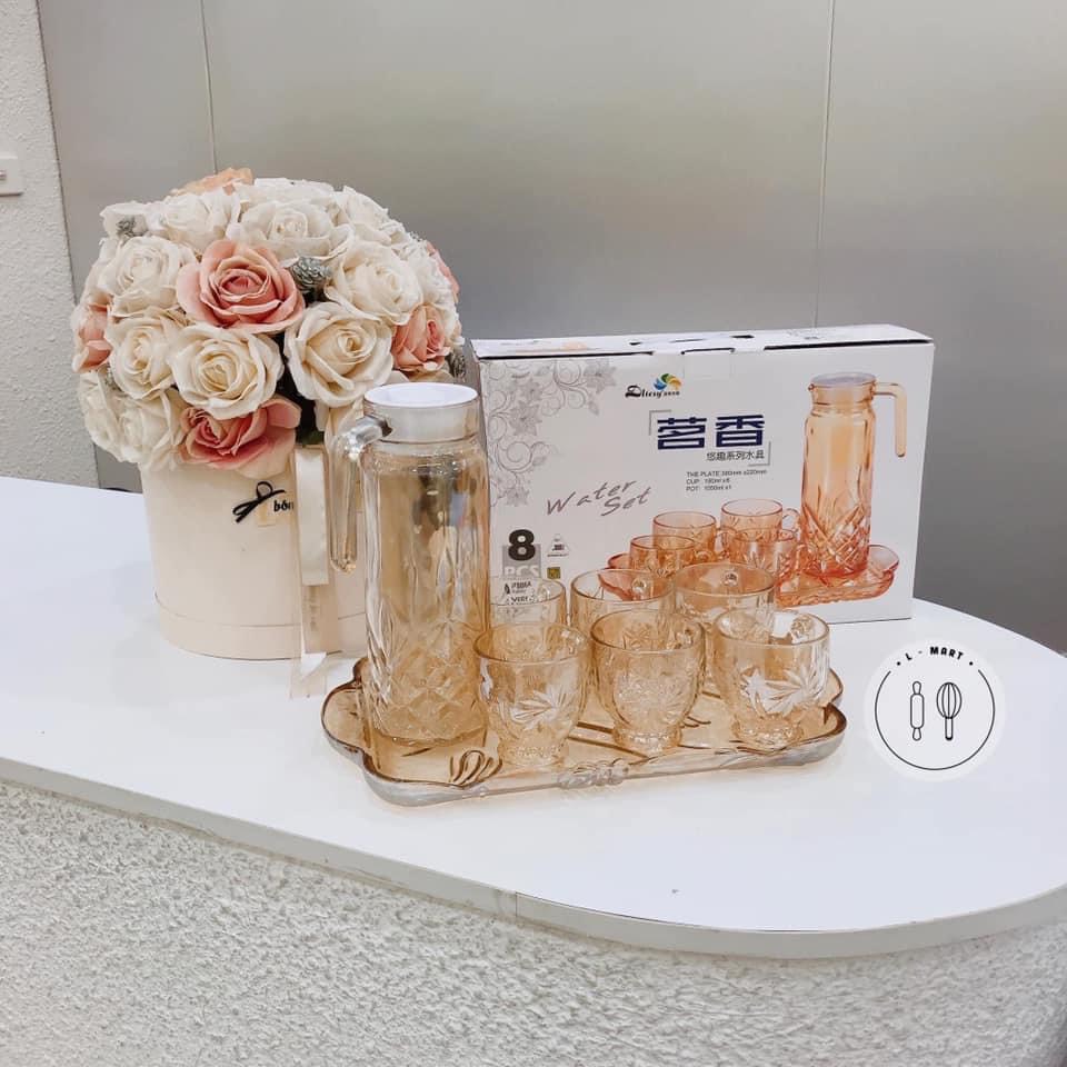 ✨BỘ BÌNH ĐỰNG NƯỚC UỐNG KÈM 6 CỐC VÀ KHAY THỦY TINH VÀNG CAO CẤP DLICSY