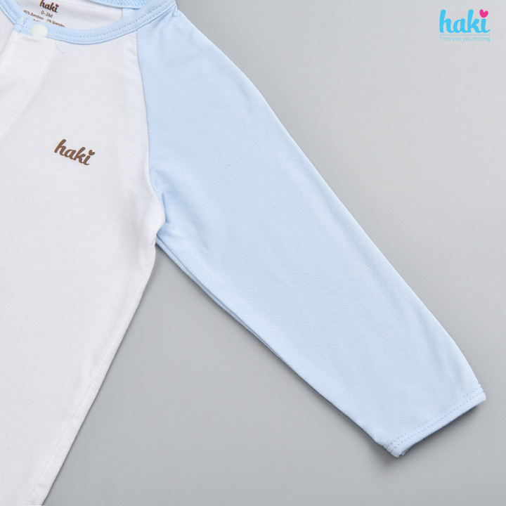 Haki sử dụng 100% cúc bấm nhập khẩu từ Nhật, mịn, lì và chắc chắn tuyệt đối. Điều này giúp ba mẹ dễ dàng thao tác khi thay trang phục cho bé, đồng thời để bé thoải mái khi lẫy, bò mà chẳng lo cứng cộm.