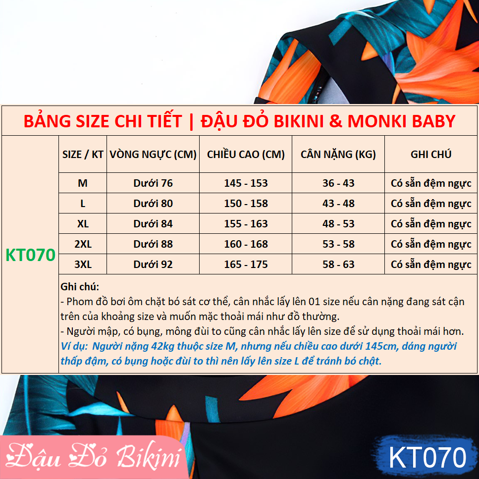 - Size Nữ (tùy chiều cao): One Size cho cân nặng từ 38-50Kg - Màu chủ đạo: Nhiều màu và mẫu theo lựa chọn của khách hàng. - Thiết kế hai mảnh, có sẵn mút