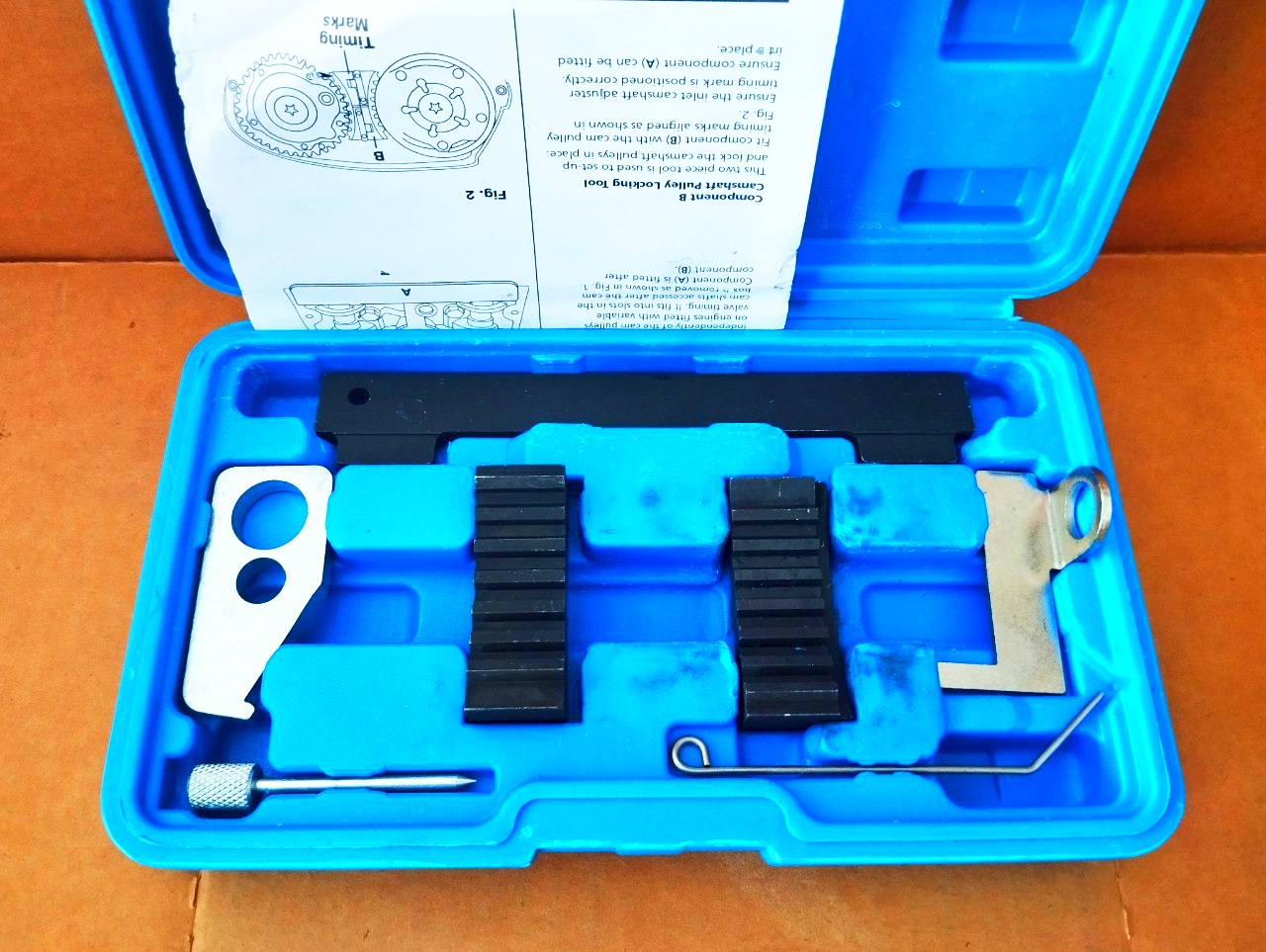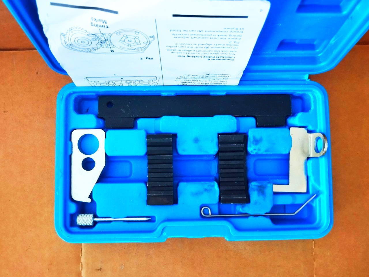 - Bộ tool bao gồm : 1 dụng cụ khóa trục cam 2 dụng cụ khóa bánh răng trục cam 1 dụng cụ khóa bánh đà 1 cờ lê căng đai động cơ 1 dụng cụ khóa căng đai gân chữ V 1 dụng cụ khóa trục khuỷu 1 dụng cụ khóa căng đai định thời Trình tự tiến hành: