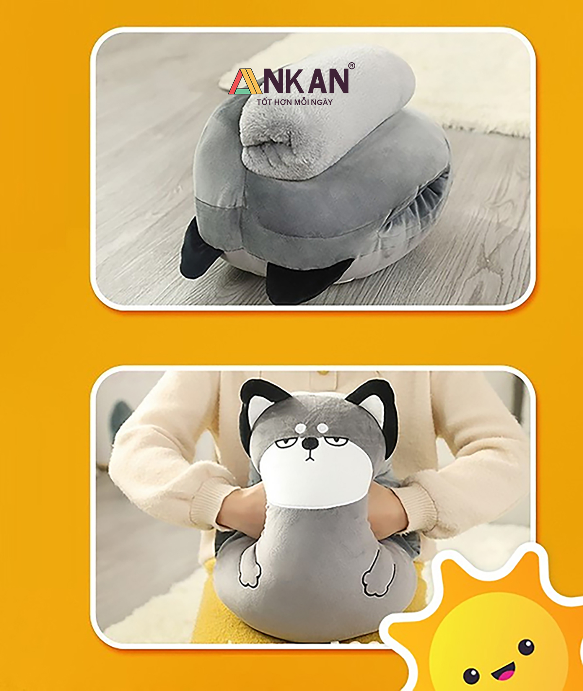 Bộ Chăn Gối Văn Phòng Đa Năng Hình Thú Gấu Bông Dễ Thương, Tiện Lợi Cho Bé Đi Học Và Du Lịch CHĂN GỐI VĂN PHÒNG ANKAN CÓ GÌ ĐẶC BIỆT Thiết kế hình thú xinh xắn, phù hợp làm quà sinh nhật, quà tặng bạn bè, người yêu, đồng nghiệp. Đa năng 3 trong 1: vừa là gối ôm – gối tựa lưng – gối luồn tay, kèm chăn êm giữ ấm. Sử dụng tiện lợi cho nhiều mục đích: ngủ trưa văn phòng, đi học, đi làm, du lịch. Trên sản phẩm có nhãn chữ “はい” (hai) – nghĩa là “Vâng” trong tiếng Việt, mang đến cảm giác dễ thương, tích cực và gần gũi theo phong cách Nhật Bản. CAM KẾT TỪ ANKAN Sản phẩm đúng mô tả, đúng mẫu, đúng kích thước. Đổi trả trong 15 ngày nếu khách không hài lòng. Hoàn tiền 100% nếu sản phẩm lỗi do nhà sản xuất. Đóng gói sạch sẽ, an toàn, giao hàng nhanh chóng. THÔNG SỐ KỸ THUẬT Kích thước gối: 40 x 35 cm. Kích thước chăn: 100 x 170 cm (được lồng gọn trong gối). Chất liệu vỏ: vải nhung siêu mềm. Chất liệu ruột: bông PP cao cấp, an toàn cho da. Trọng lượng: khoảng 800g. Có 4 kiểu dáng để bạn lựa chọn là Cáo Đỏ, Cá Voi Xanh, Cừu Trắng và Gấu Nhật Bản ƯU ĐIỂM NỔI BẬT Vải nhung mềm mịn, thoáng khí, dễ giặt sạch.