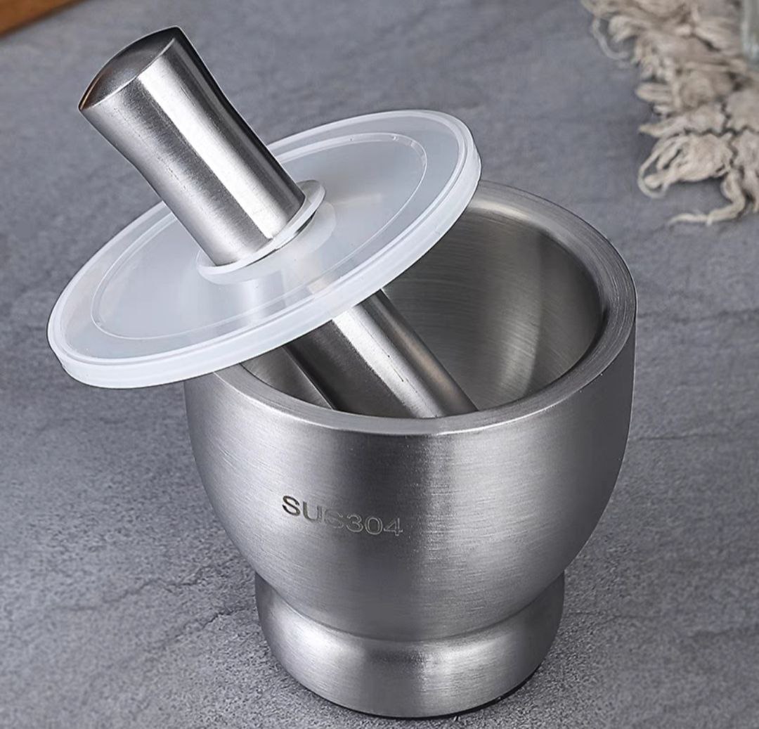 Bộ cối chày inox 304 nguyên khối có nắp đậy nặng 2kg, an toàn dễ vệ sinh sau khi đăm dã nguyên liệu