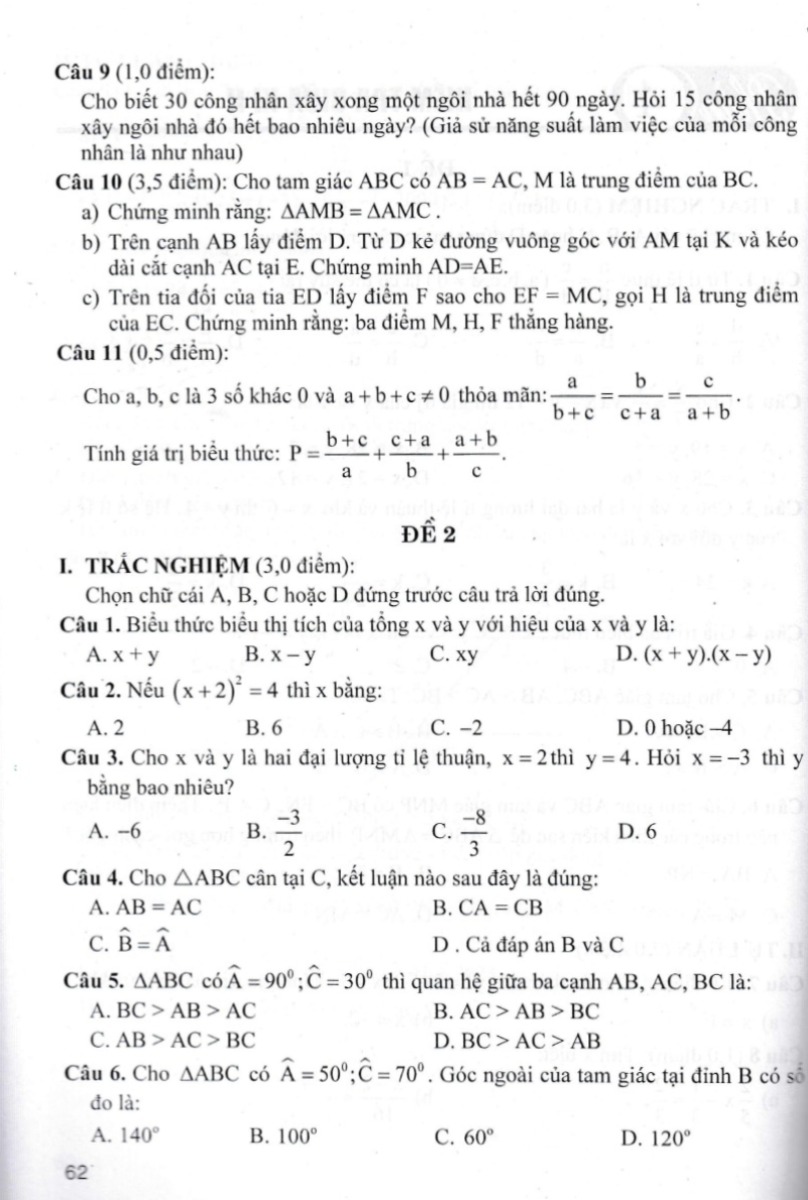 Gửi các em lớp 7 đề tham khảo môn Toán cuối học kì 2.