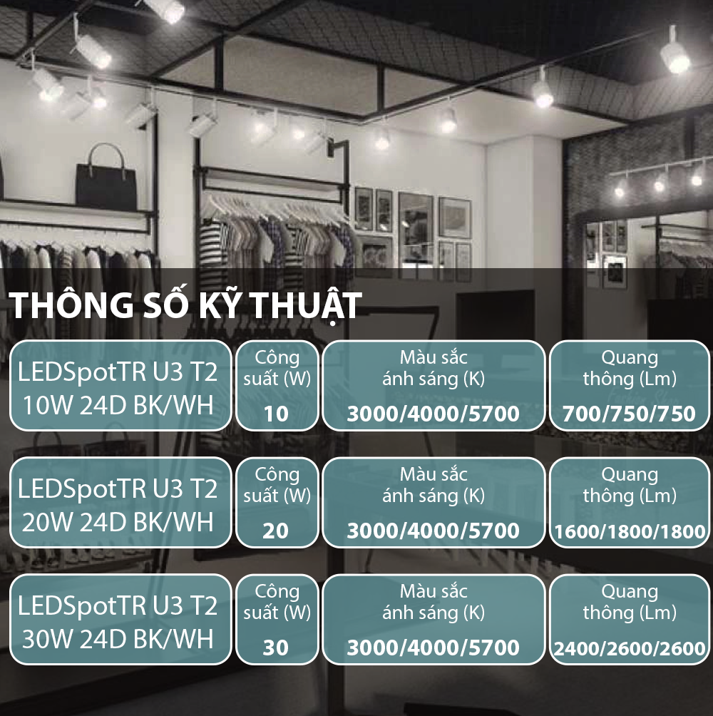 LEDSpotTR-U3 T2 10W 24D    10W              700/750/750lm         80               3000/4000/5700K               Trắng/Đen
