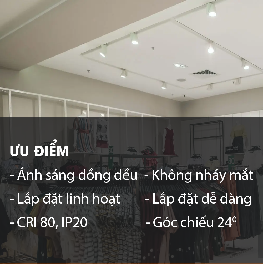 Điện áp: 220V/50-60Hz Màu ánh sáng: Sáng Trắng ấm 4000K Quang thông: 1800lm Góc chiếu: 24º Tuổi thọ (giờ): 25000 (L70) Kích thước (DxHxL)mm: 90x180x140mm Ưu điểm của Đèn LED Tracklight 25W - Nguồn sáng