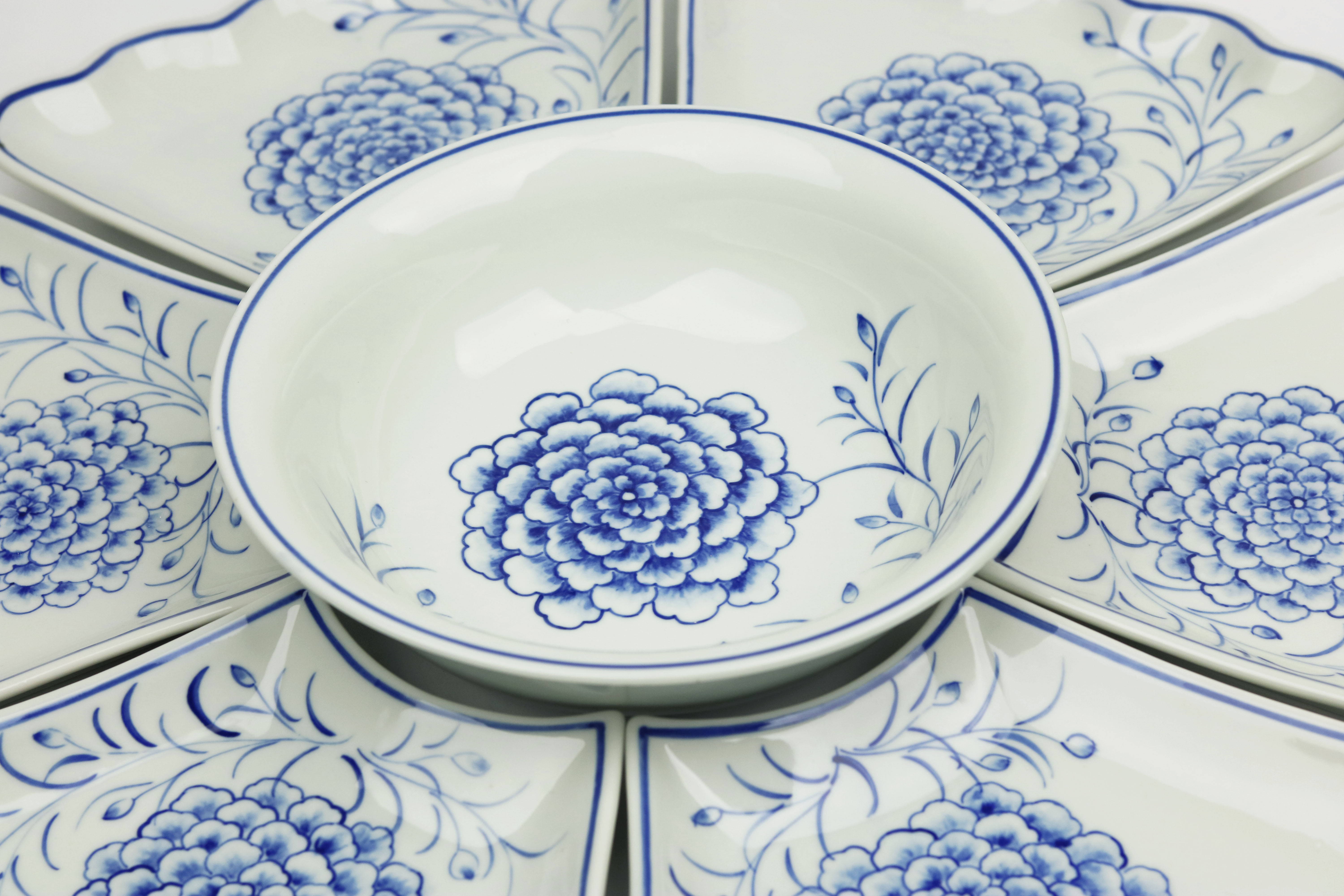 BỘ BÁT ĐĨA HOA MẶT TRỜI TRẮNG TÔ HOA 7 CHI TIẾT Gồm: -1 bát tô và 6 cánh đĩa (đường kính cả bộ 54cm) bát tô đường kính 20cm