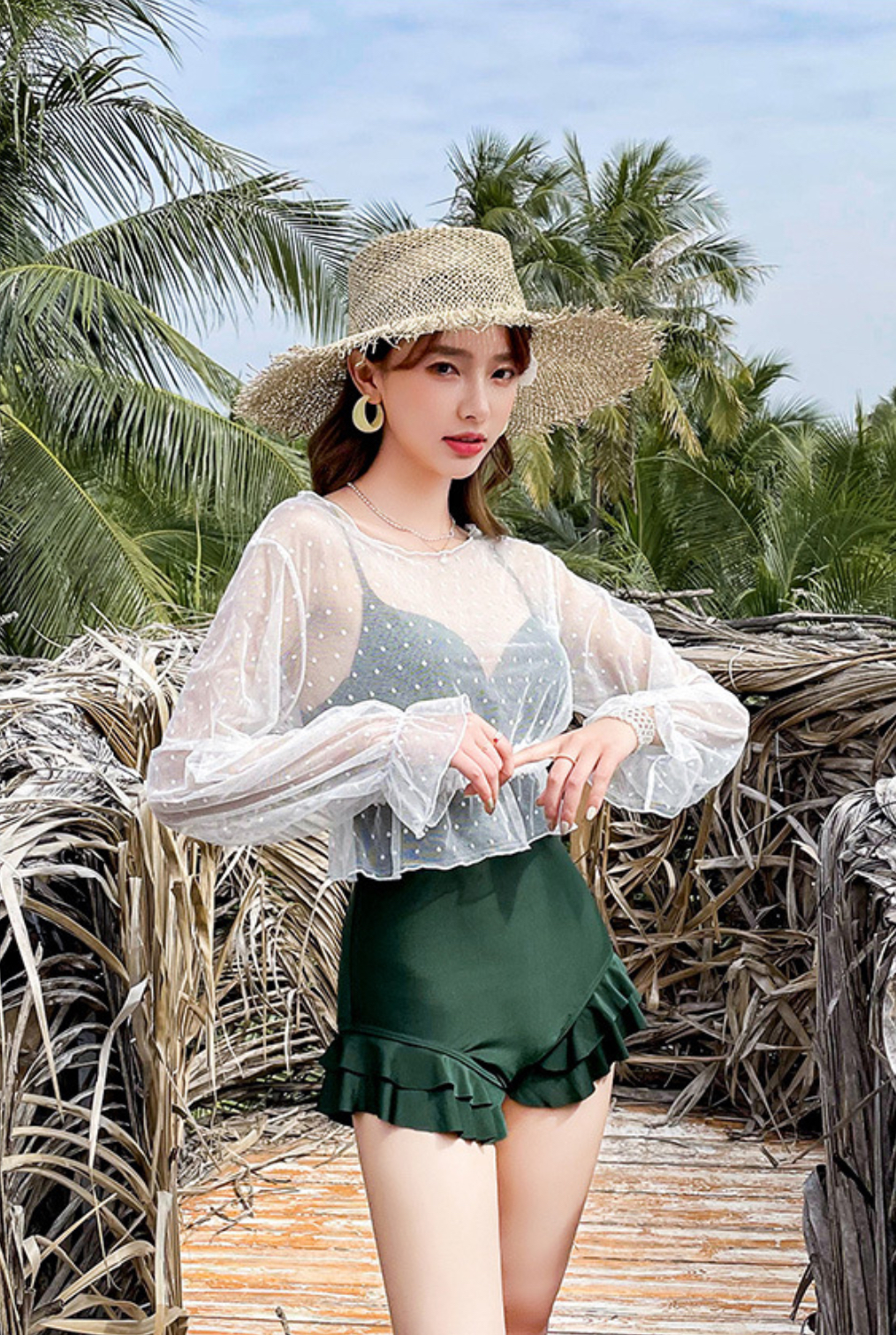✨Bộ đồ bơi bikini nữ 1 mảnh đi tắm biển kèm áo croptop ren trắng chấm bi tiểu thư hot trend 2021- B05