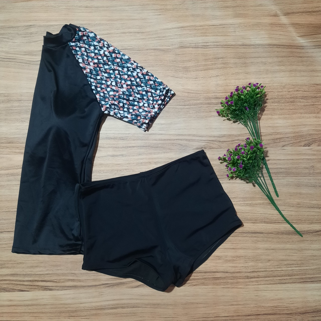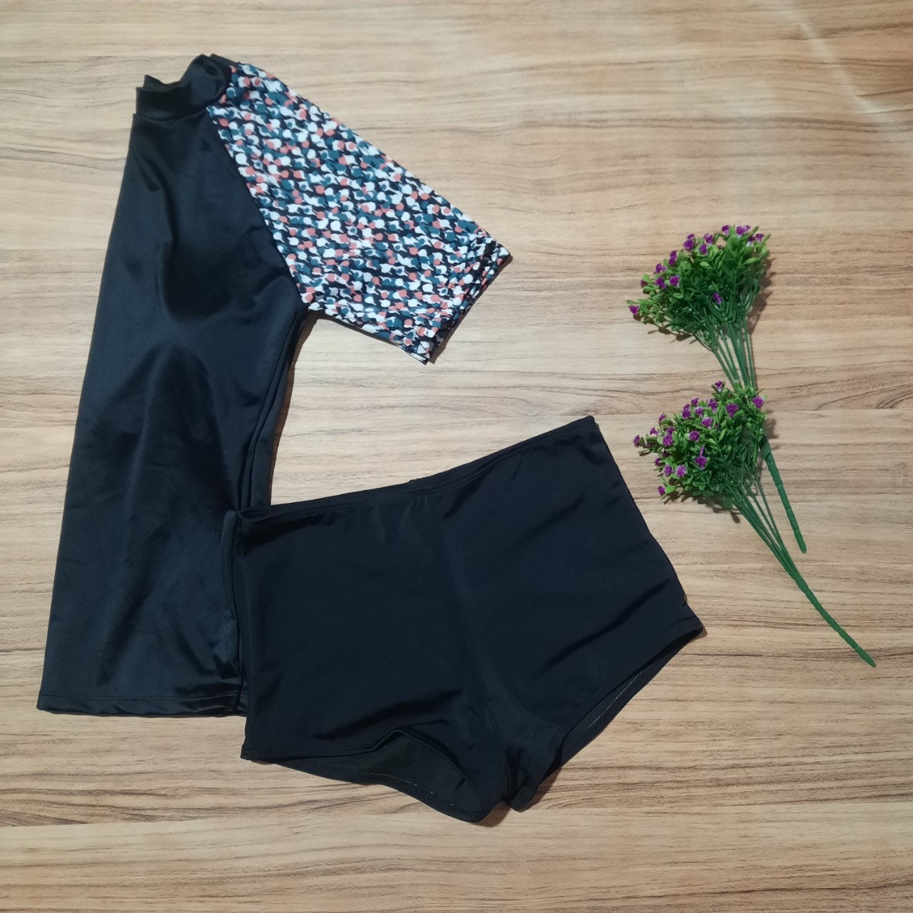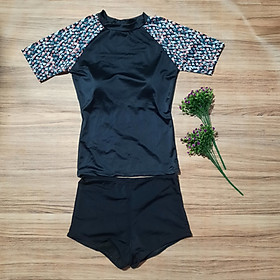 - Mẫu đồ bơi mới nhất cho các bạn nữ thích sự trẻ trung kín đáo mà vẫn thu hút khi đi biển, đi bơi. - Áo dáng ngắn tay phối hoạ tiết trẻ khoẻ,