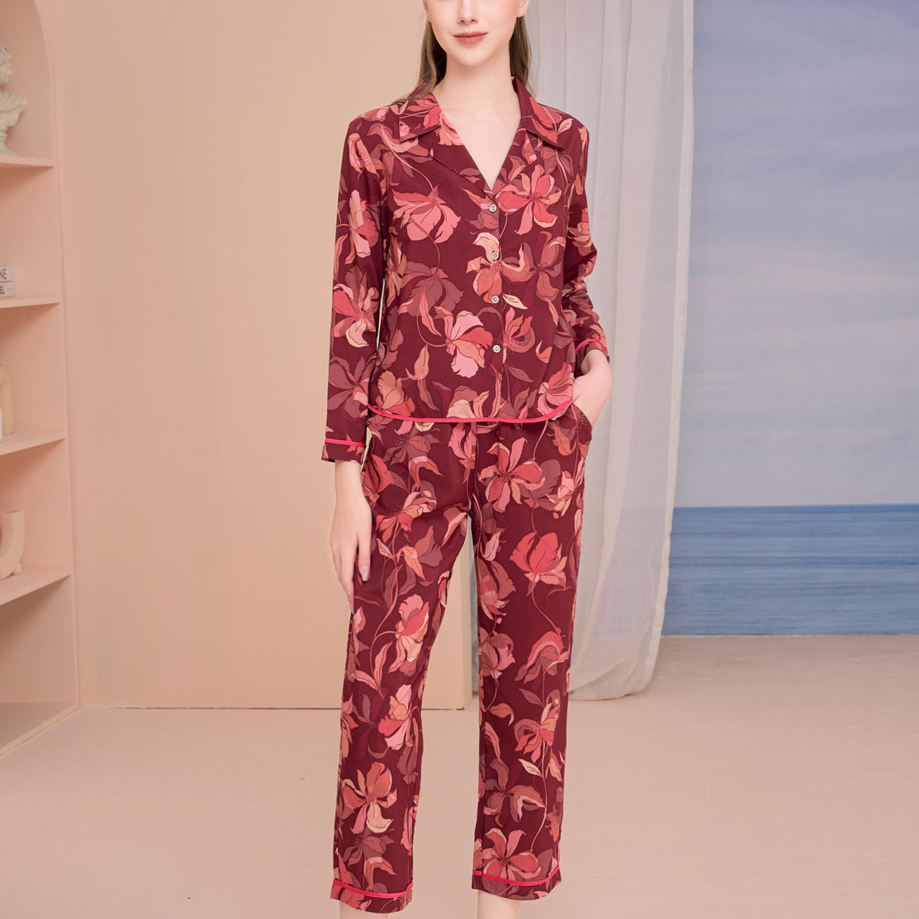 Bộ đồ ngủ Pijamas tay dài, quần dài họa tiết môi tím, kiểu dáng áo ôm, quần suông dài, phong cách năng động trẻ trung khi mặc ở nhà - Màu sắc: trắng phối tím