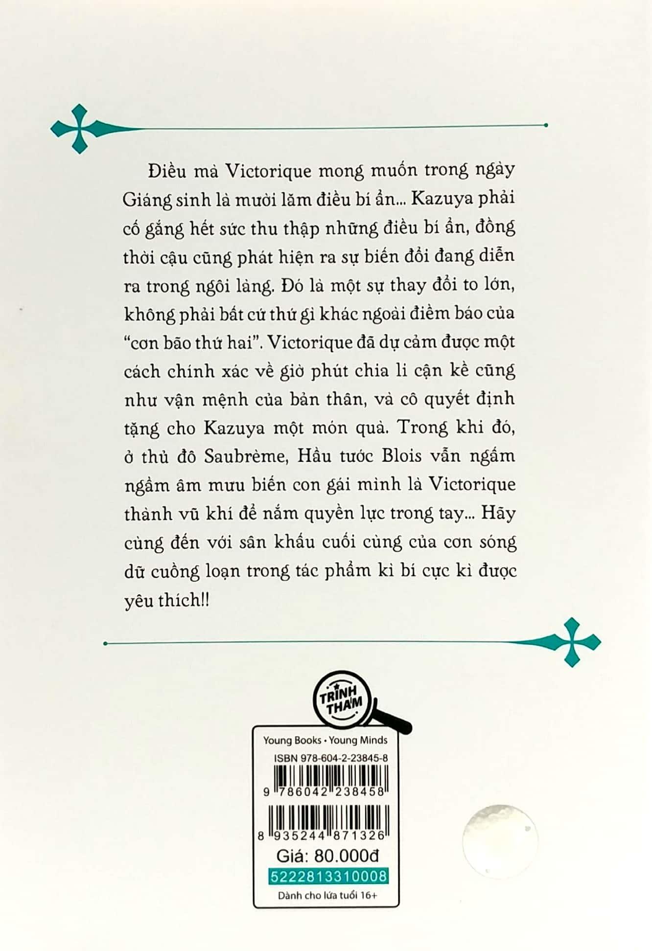 Mua tại TiktokTrước điềm báo của “cơn bão thứ hai”, Victorique đã dự cảm được một cách chính xác về giờ phút chia li cận kề cũng như vận mệnh của bản thân, và cô quyết định tặng cho Kazuya một món quà. Sự mất mát và biến đổi to lớn đã đến với Avril, với Cécile, với Grévil và với cả thế giới cũ. Điều đang chờ đợi họ ở phía trước sẽ là gì? Liệu Victorique có thể tái ngộ với Kazuya? Đây là hai tập cuối cùng đầy cảm động của loạt truyện kì bí cực kì nổi tiếng!!