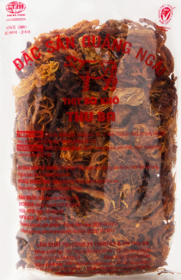 BÒ KHÔ THU BA là món đặc sản Quảng Ngãi, đạt tiêu chuẩn ISO 22000:2018 và là Hàng Việt Nam Chất Lượng Cao do Người tiêu dùng bình chọn  Sản phẩm được sản xuất theo công thức