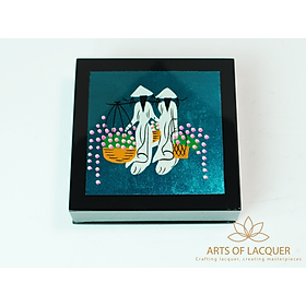 Đây là một bộ sáu chiếc đế lót ly được thiết kế vô cùng tinh xảo và độc đáo. Mỗi chiếc lót ly có hình vuông, được đặt trong một khung màu đen mạnh mẽ tạo nên sự tương phản rõ rệt với hình ảnh trung tâm. Nền của hình ảnh trên lót ly là màu xanh dương nhẹ nhàng, tạo cảm giác thanh bình và dễ chịu. Hình ảnh nổi bật trên nền xanh là hai người phụ nữ mặc trang phục áo dài truyền thống Việt Nam và đội trên đầu chiếc nón lá. Trên vai họ là những gánh hoa chứa những bông hoa màu sắc tươi sáng mang đậm bản sắc văn hóa Việt.