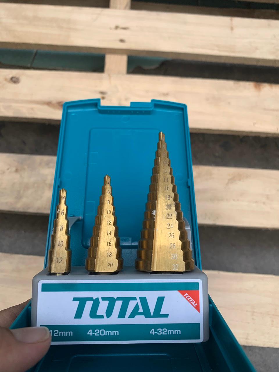 -Bộ 3 mũi khoan chóp nón gồm:1 pcs 4-12 mm, 1mm/bậc , đk đuôi: 6mm. 1 pcs 4-20 mm, 2mm/bậc , đk đuôi: 8mm