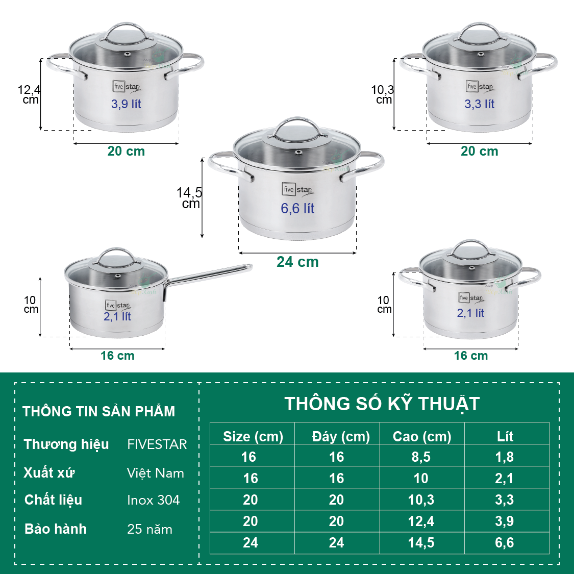 Bộ nồi chảo xửng hấp 3 Đáy Inox 430 cao cấp Fivestar Standard bếp từ nắp kính , tặng 1 vá canh Bộ nồi inox có 9 món gồm : +Quánh có đường kính