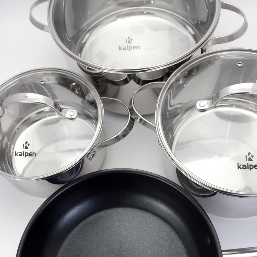 - Bộ nồi Inox 5 lớp đáy của Kalpen được làm từ chất liệu Inox 5 lớp, với đáy nồi có thiết kế đặc biệt để giúp nồi truyền nhiệt đều và nhanh chóng. Điều này giúp cho việc nấu nướng trở nên hiệu quả khi có thể sử dụng được trên nhiều loại bếp khác nhau.
