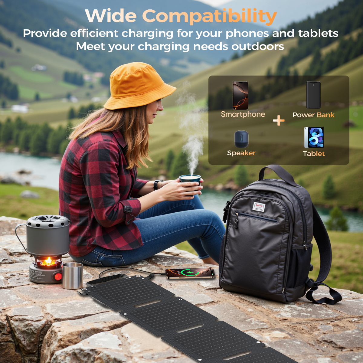 – Được trang bị 4 tấm pin năng lượng mặt trời chất lượng cao, thiết bị cho khả năng chuyển đổi năng lượng hiệu quả, cung cấp công suất sạc lên đến 28W, đủ để sạc điện thoại, máy tính bảng, tai nghe, pin dự phòng và các thiết bị USB khác.