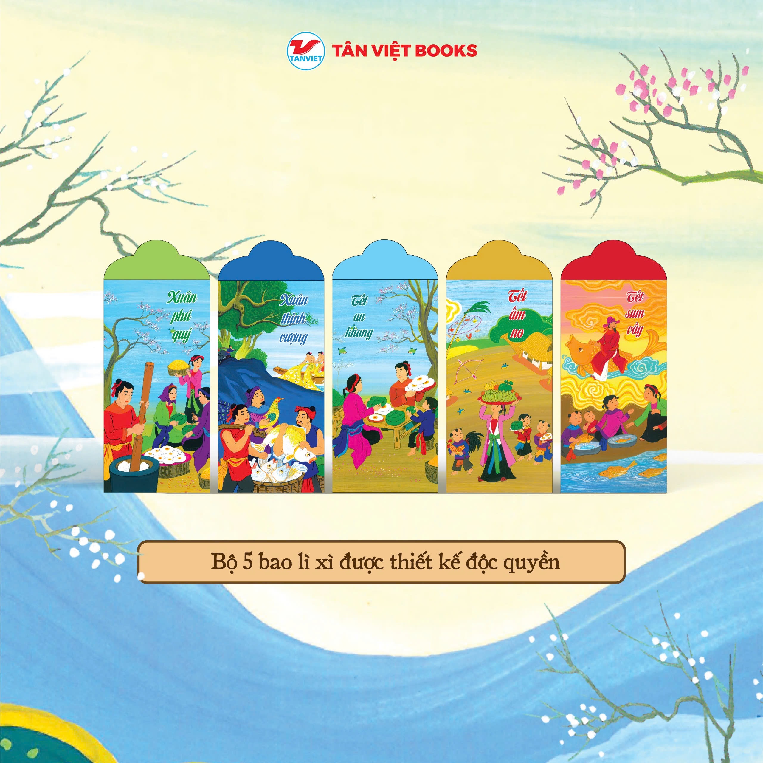 Sách gia công bìa cứng bồi xốp mút, in màu trên giấy Offset định lượng 120gsm, tặng kèm lì xì hình những bức tranh dân gian.