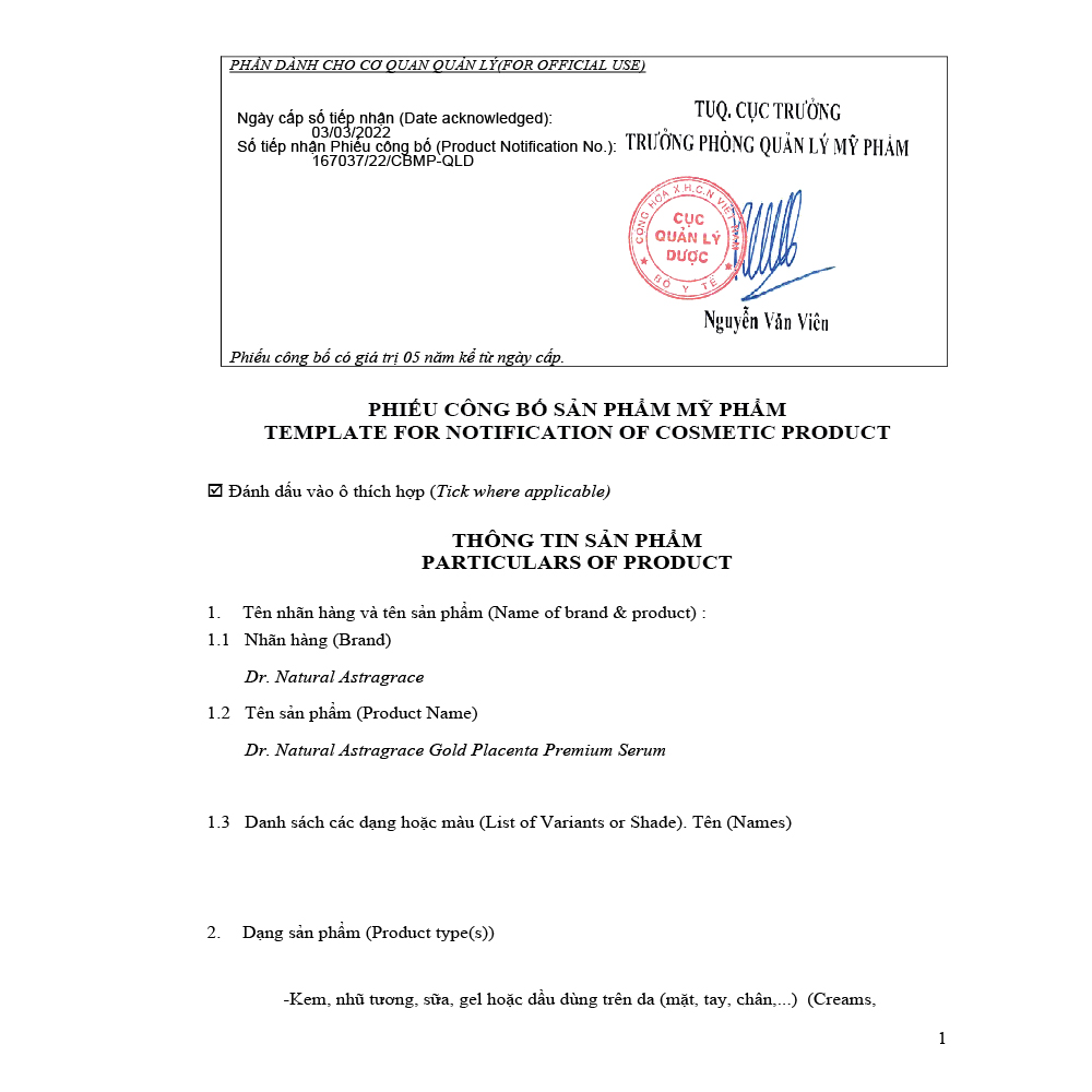 Serum vàng nhau thai cừu Dr Natural Astragrace Gold Placenta Premium Serum giúp trắng da, chống nhăn
