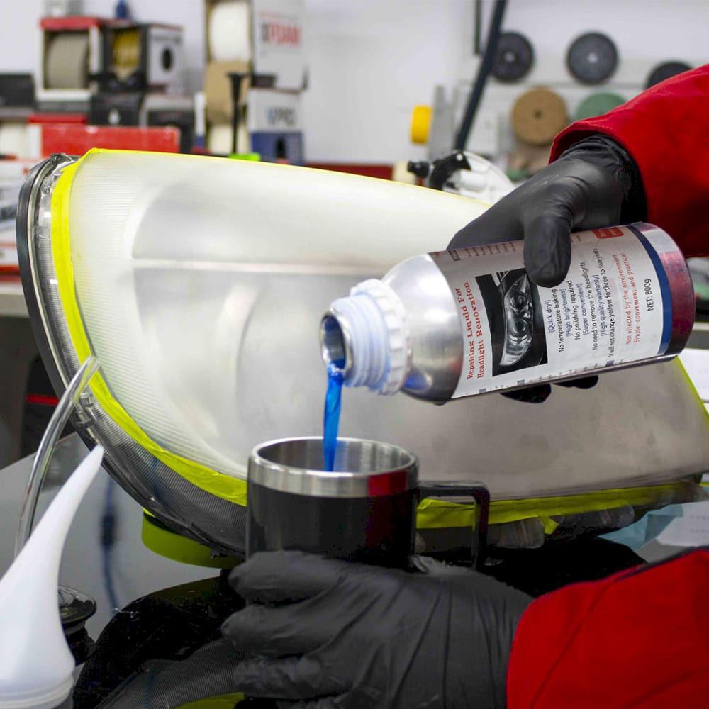 Bước 5: Đổ dung dịch vào cốc làm nóng và bắt đầu xịt phủ đều tay lên bề mặt đèn pha cho đến khi không còn nhìn thấy vết xước.