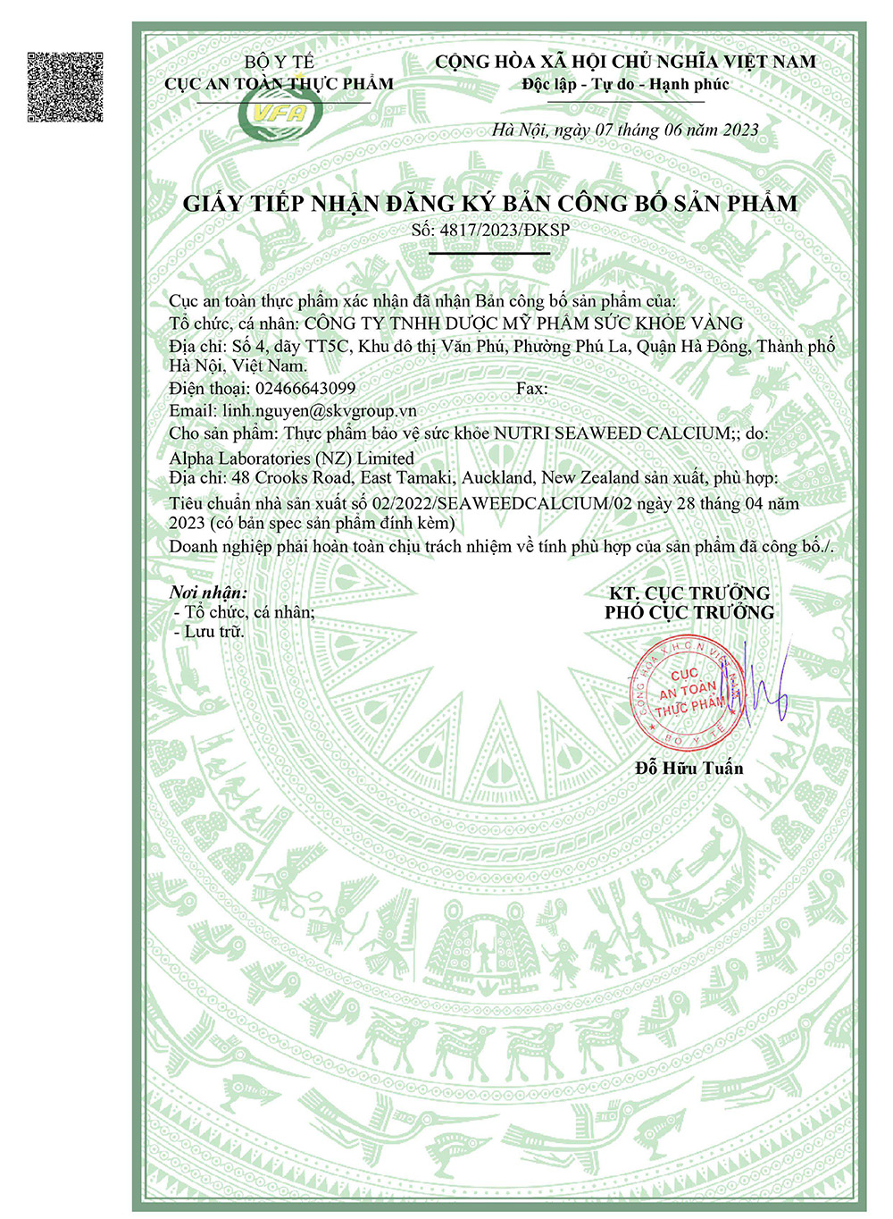 - Viên uống Canxi hữu cơ New Zealand Nutri Seaweed Calcium 60 Viên Bổ sung canxi hữu cơ từ tảo biển Sản xuất tại New Zealand GIẤY ĐKSP CỦA BỘ Y TẾ: 4817/2023/ĐKSP NUTRI SEAWEED CALCIUM là nguồn cung cấp canxi hữu cơ từ tảo biển, kết hợp vitamin K2 và D3 giúp cơ thể hấp thu canxi nhanh hơn, hỗ trợ tăng chiều cao tối ưu và hỗ trợ xương chắc khoẻ. CÔNG DỤNG CỦA CANXI HỮU CƠ NUTRI SEAWEED CALCIUM - NUTRI HEALTH : Bổ sung canxi từ tảo biển hỗ trợ xương chắc khỏe. VÌ SAO CHỌN NUTRI SEAWEED CALCIUM:
