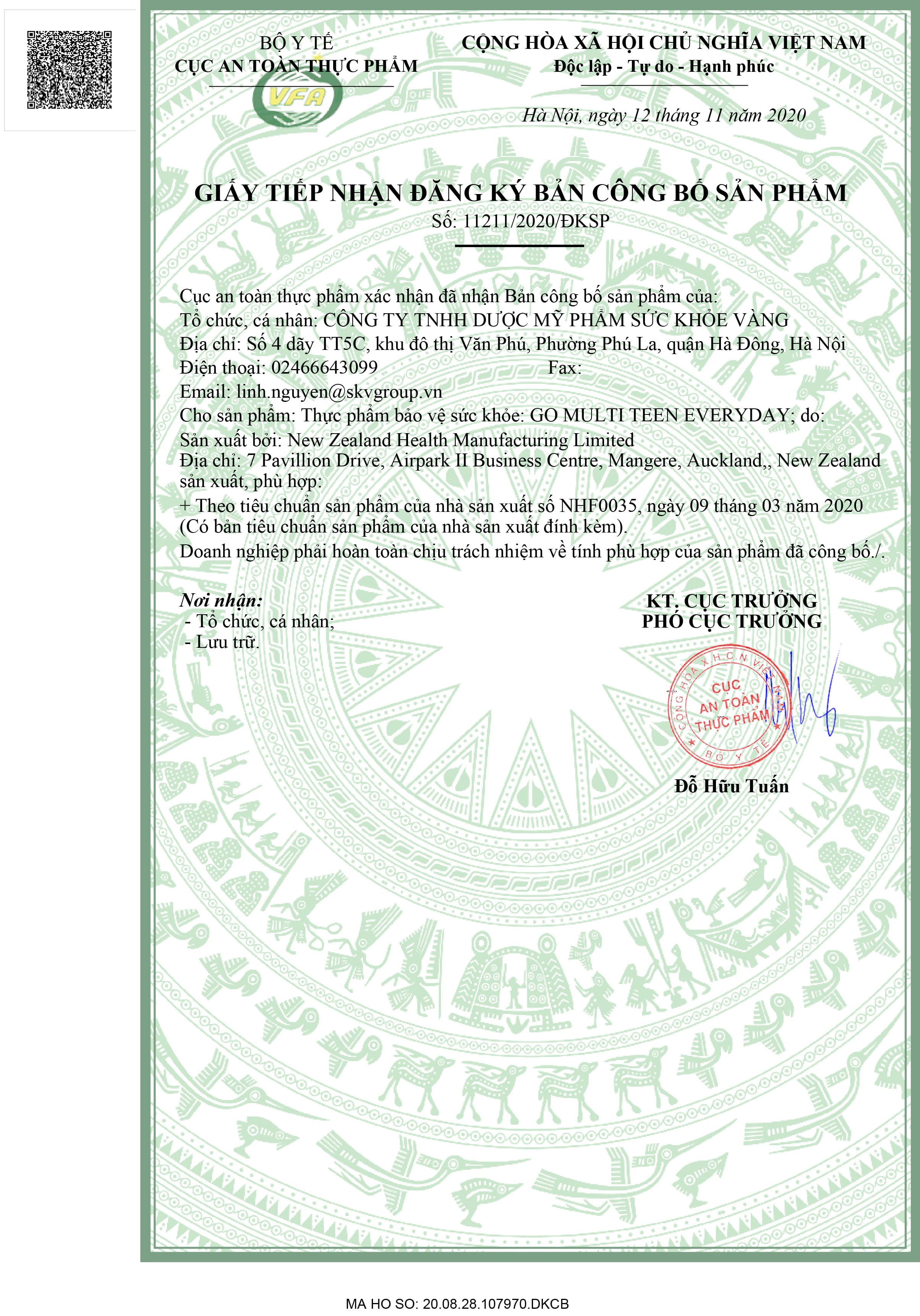 - Vitamin E (D-alpha tocopherol) 2IU. Vỏ nang thực vật từ cellulose thực vật không biến đổi gen. CÔNG DỤNG: Giúp bổ sung các vitamin, khoáng chất và một số dưỡng chất hỗ trợ duy trì và tăng cường sức khỏe cho trẻ ở tuổi tăng trưởng ĐỐI TƯỢNG: • Thanh thiếu niên và trẻ em trong tuổi tăng trưởng • Người thường xuyên vận động • Người cần mức độ tập trung cao • Trẻ em trong kỳ thi cử có nhu cầu bổ sung vitamin (Theo giấy phép XNCB của bộ Y Tế: 25634/2017/ATTP-XNCB; Số: 11211/2020/ĐKSP ( Lần 2)) QUY CÁCH & LIỀU DÙNG:
