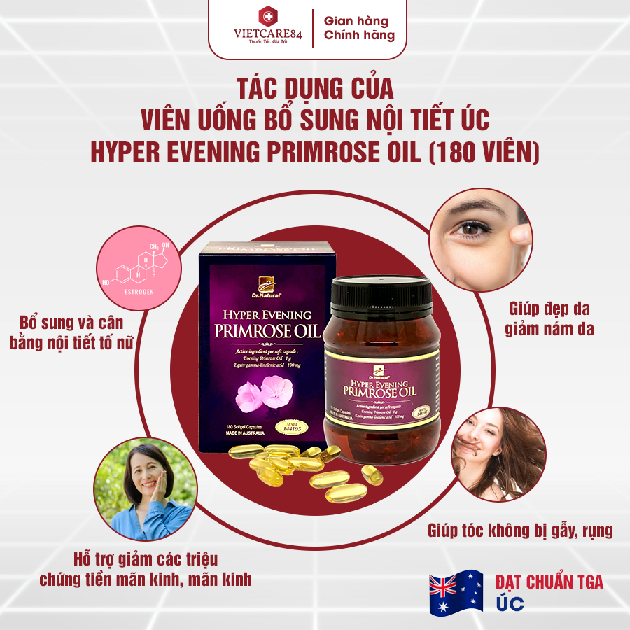 - Nhập khẩu chính hãng từ Australia. Viên uống nội tiết tố Hyper Evening Primrose Oil được sản xuất tại nhà máy đạt chuẩn GMP, đáp ứng các tiêu chuẩn khắt khe nhất của Cục Quản Lý Thuốc Trị Liệu của Úc (TGA); giúp bạn thực sự yên tâm khi sử dụng