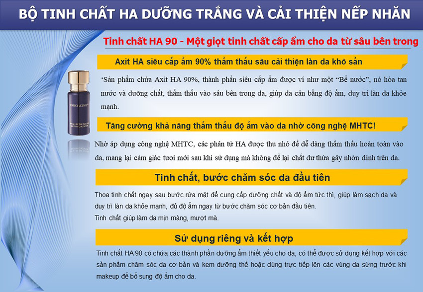 Ra đời như giải pháp bù nước cấp tốc, sử dụng các vi phân tử HA thế hệ mới, vận chuyển dưỡng chất vào sâu lớp biểu bì, làn da trở nên ẩm mịn, đàn hồi.
