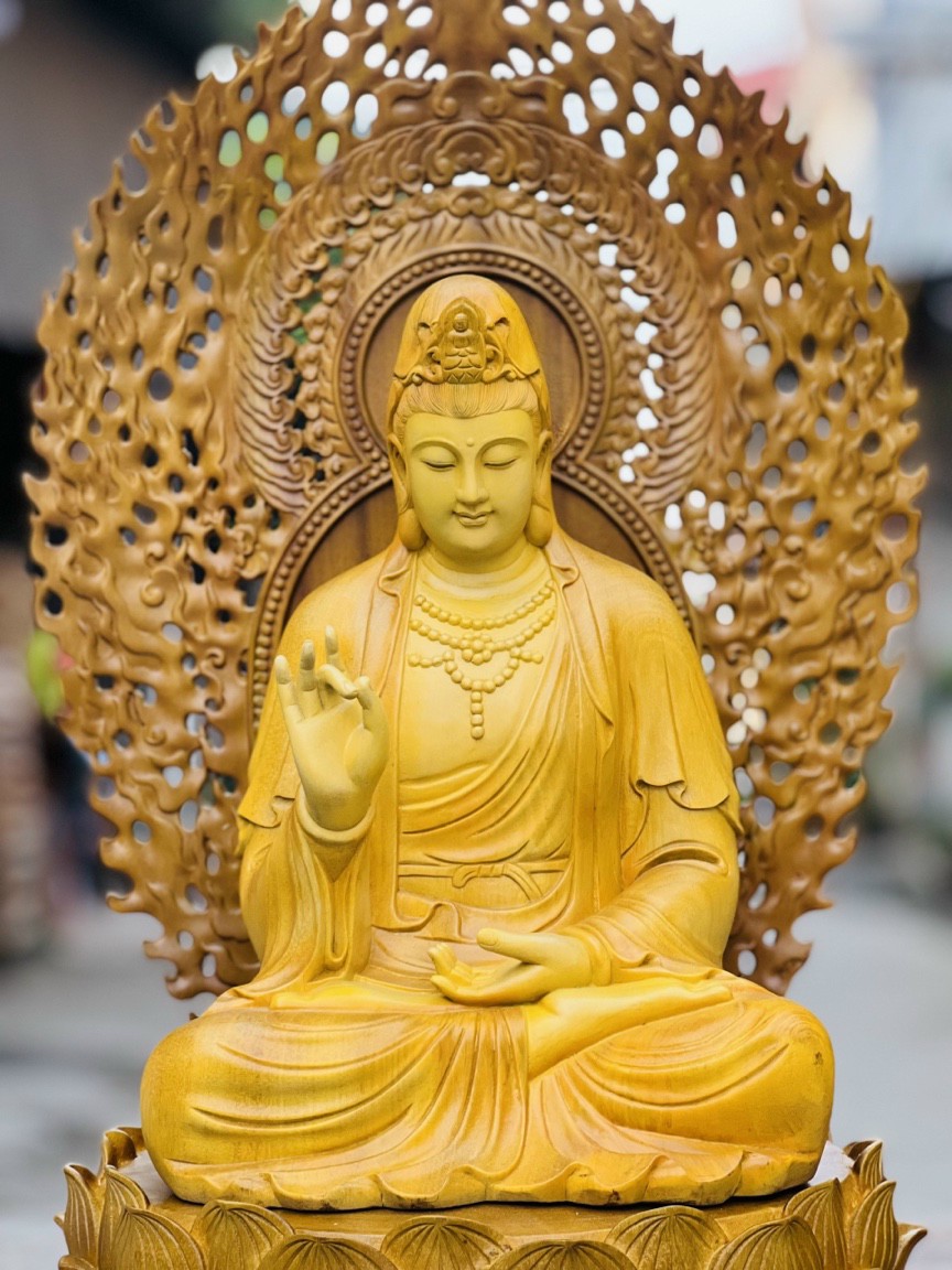 _ Bộ tượng phật tây phương tam thánh được làm bằng chất liệu gỗ gõ vàng liền khối tự nhiên 100%  _Kt cao tổng 90×48×48cm _ Bộ tượng phật tam thánh được trạm khắc vô
