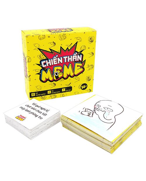 Giới thiệu Boardgame Thẻ Bài Chiến Thần Meme - BGV Bạn có tự tin m.ình là một người hài hước, đầy tính sáng tạo, xứng đáng với danh hiệu: chiến thần meme, kẻ hủy diệt nỗi buồn, quái vật Imao, chúa tể nụ cười, ông hoàng làng hề, tù trưởng vui tính, đại đội trưởng trung đoàn cừ ẻ, thần đồng dảk dả Vậy sao bạn không thử sức để chứng minh độ mặn mòi của bản thân bằng bộ game này? Chỉ với thẻ bài CAPTION và MEME, hãy kết hợp nó lại với nhau sao cho phù hợp – để tạo nên những combo tình huống cực hài hước theo cách riêng của bạn. Tới đây nào! Hãy cùng CHIẾN THẦN MEME tạo nên những tràng cười bò lê lết, đưa cuộc vui lên đến nóc và lan tỏa nguồn năng lượng tích cực đến cho nhau. Luật chơi Nhiệm vụ của người chơi là đưa ra meme phù hợp với caption. CHIA THẺ BÀI Mỗi người chơi sẽ được chia 5 thẻ meme, số meme còn lại cho ra giữa bàn LUẬT CAPTION Lật 1 thẻ caption lên và đọc to cho mọi người cùng nghe Mọi người chọn 1 thẻ meme trên tay sao cho phù hợp nhất để react và úp xuống trước mặt. TÍNH ĐIỂM Mọi người cùng lật thẻ meme lên và bình chọn xem meme nào hay nhất Người chiến thắng sẽ giữ lại thẻ meme và caption để tính điểm về sau. Mọi người rút lại 1 thẻ meme sao cho thẻ bài trên tay luôn là 5. Những thẻ meme không được chọn sẽ được xào lại vào chồng thẻ bài meme Tiếp tục trò chơi đến khi có một người đạt được 5đ sẽ là người chiến thắng Lưu ý: Phụ họa cho cái meme tâm đắc của m.ình có thể sẽ thu hút thêm lượt vote của người khác đó!