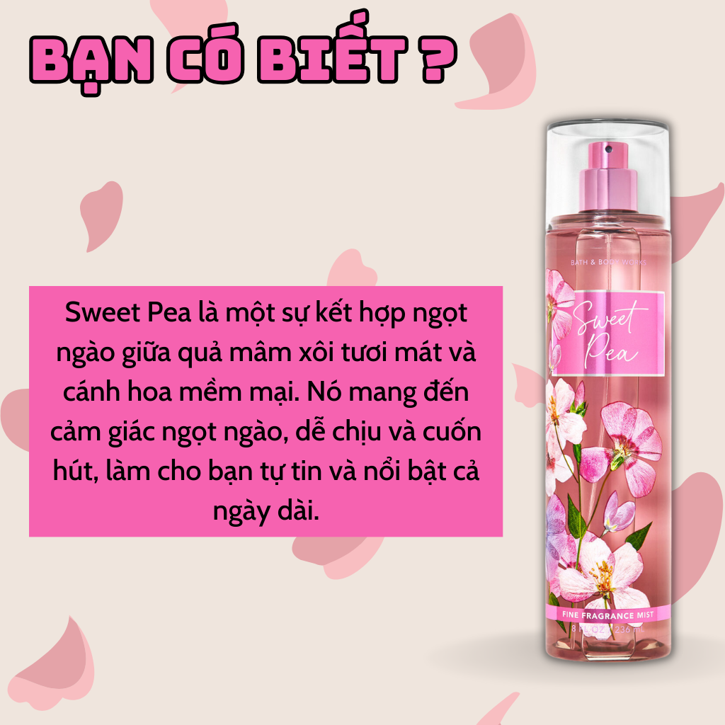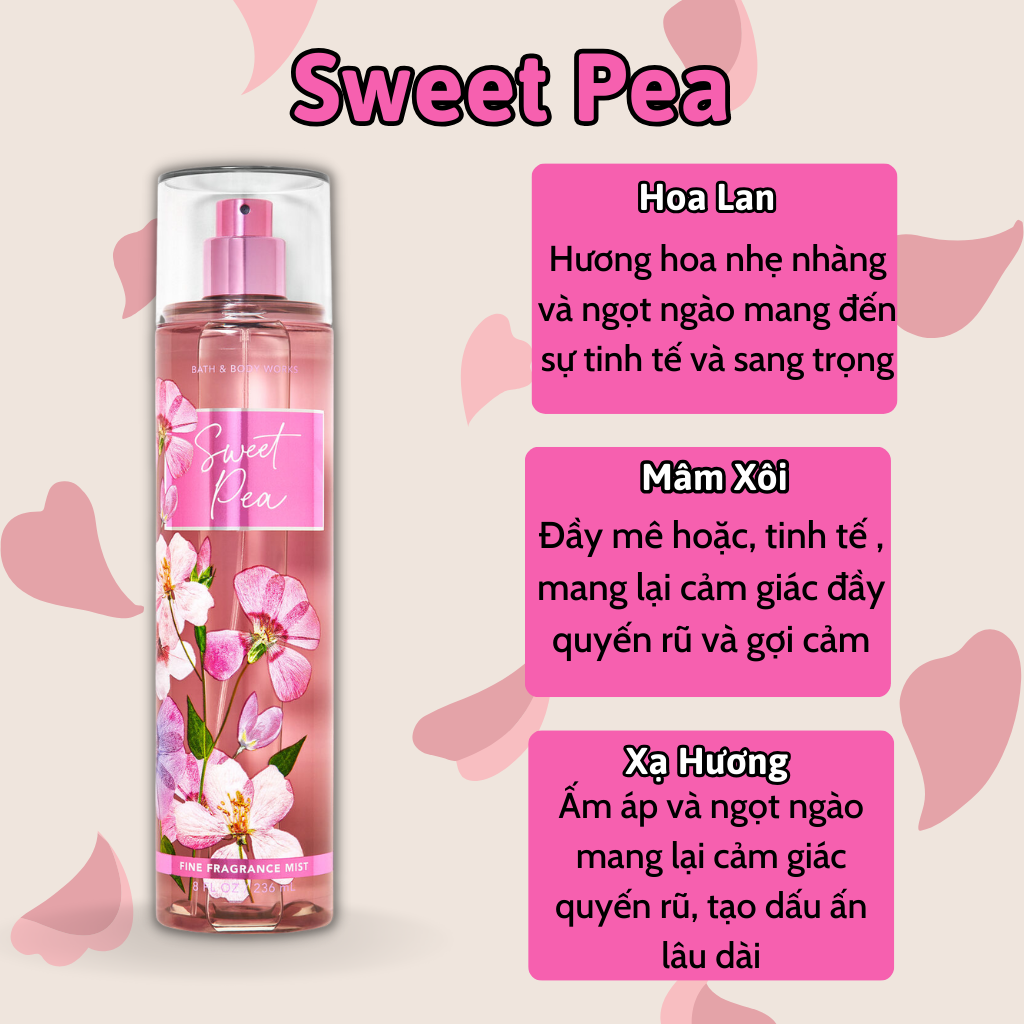 - Tên sản phẩm: Body Mist Bath And Body Works Nam Nữ Chính Hãng Sweet Pea.